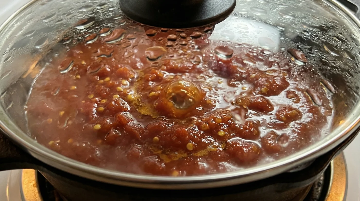 Para quien cocina entre prisas o niños llorando: No puedes permitirte limpiar salpicaduras de salsa por toda la pared. La solución ideal es la técnica de la cuchara. Coloca una cuchara de madera cruzada sobre la olla y apoya la tapa sobre ella. Así frenas los proyectiles rojos, pero mantienes una rendija vital para que el vapor ácido logre escapar sin obstáculos.