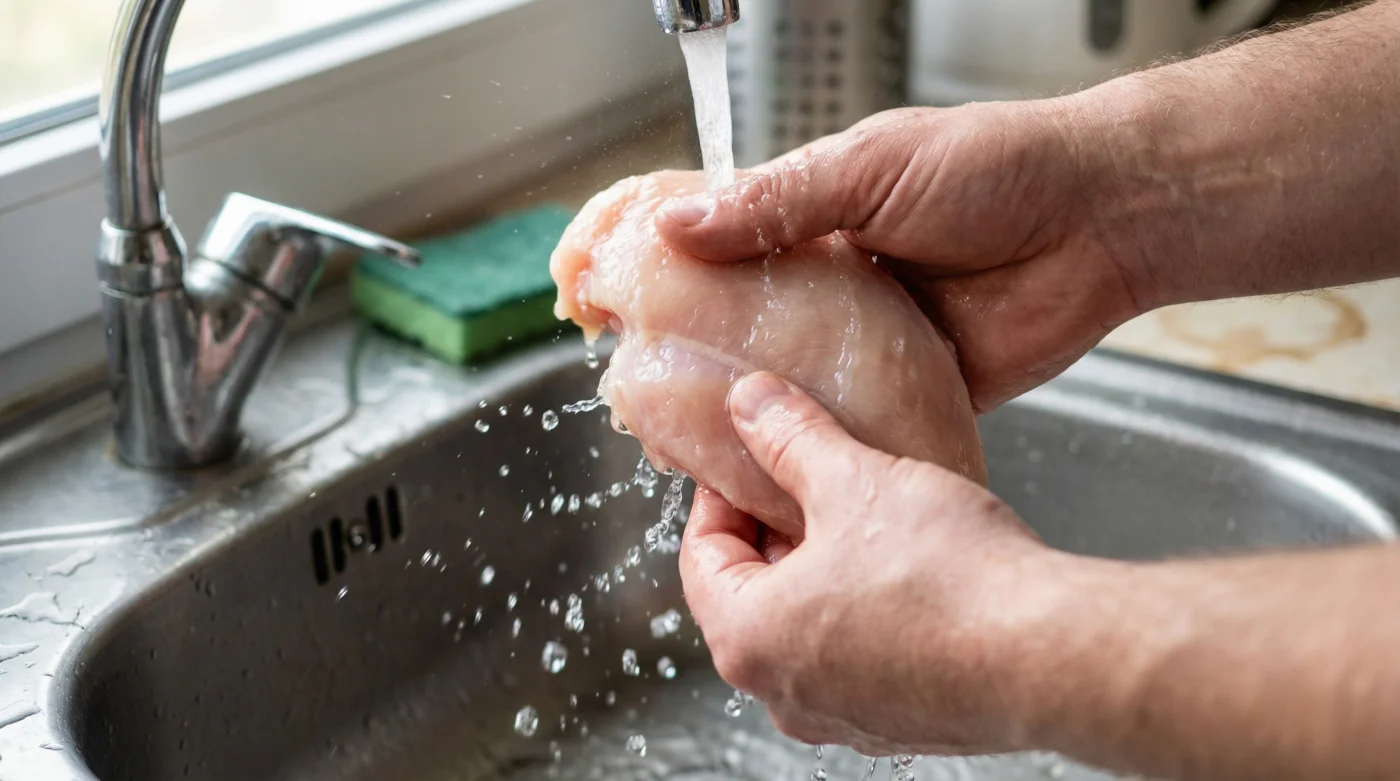 Sientes el frío del agua del grifo mientras sostienes esa pechuga de pollo cruda. Es domingo al mediodía, tu cocina huele a cebolla recién picada y a cilantro fresco. El sonido del chorro golpeando la carne pálida te da una falsa sensación de limpieza. Así te enseñaron en casa: hay que quitarle la textura viscosa, hay que enjuagarla muy bien antes del sartén. Sin embargo, cada gota que rebota contra la tarja está pintando tu espacio con un rocío invisible que no puedes oler, ver, ni probar.