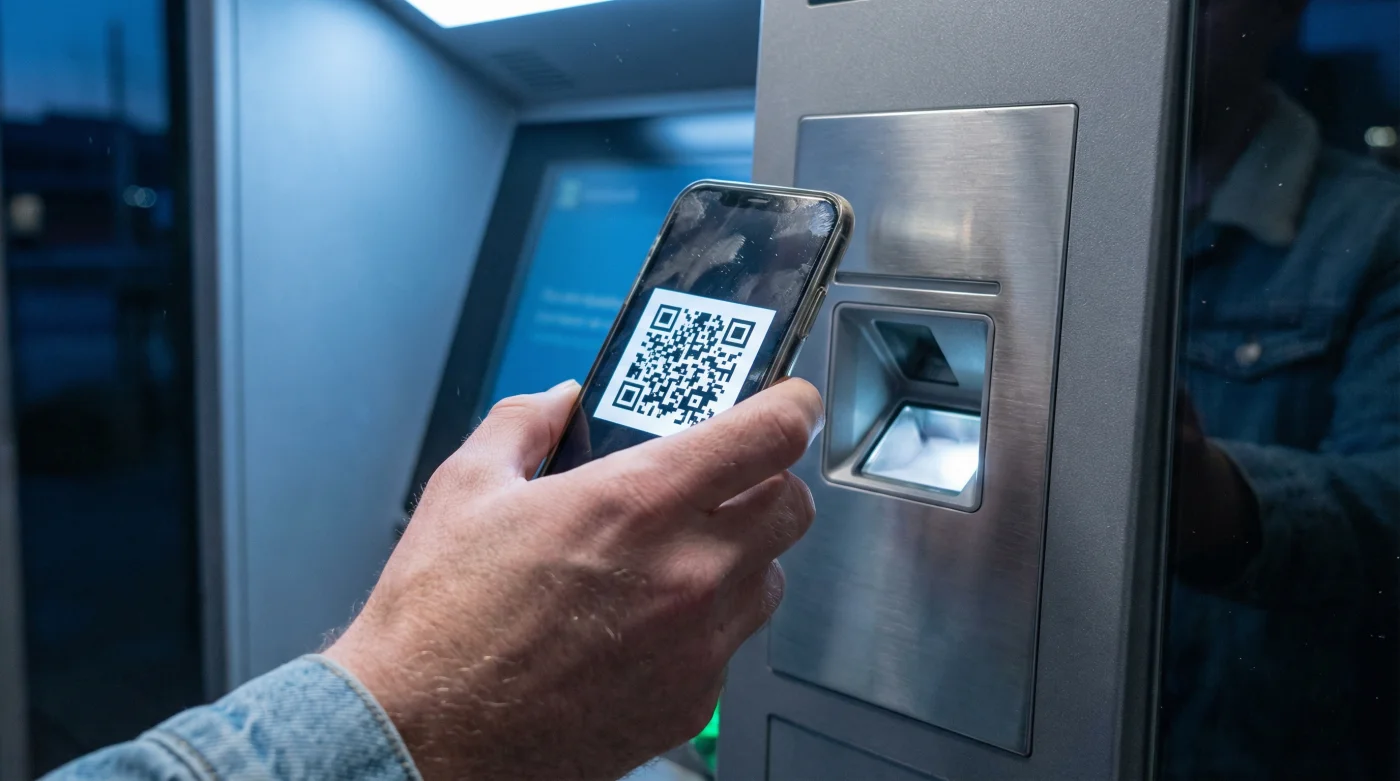 Frente a la pantalla del cajero automático, seleccionas la opción en la máquina para retiro con código QR. El sistema dibuja el código en segundos. Levantas tu teléfono, encuadras el patrón de cuadros negros y blancos en tu pantalla, y el puente se establece. El cajero y tu teléfono conversan de manera segura a través de internet. Escuchas el sonido rasposo y reconfortante de los billetes siendo contados. Tomas tu dinero en efectivo y sigues tu camino, respirando tranquilo al saber que tu cuenta bancaria está a salvo.