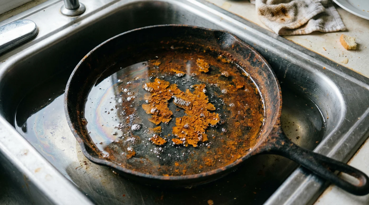 Escuchas el último chisporroteo de la carne asada apagándose lentamente en la superficie del metal oscuro. La cena ha terminado. El cansancio te gana mientras miras hacia la estufa, donde descansa ese peso pesado, negro y humeante, con restos de comida aferrados tenazmente al fondo. El instinto inmediato dicta lo que siempre has hecho con los demás trastes: abres la llave del fregadero, dejas caer un chorro generoso de agua fría sobre el sartén y piensas que dejarlo reposar hasta mañana hará que tallarlo sea un trabajo mucho más fácil. Ese es exactamente el instante en el que firmas la sentencia de daño para tu herramienta de cocina favorita.