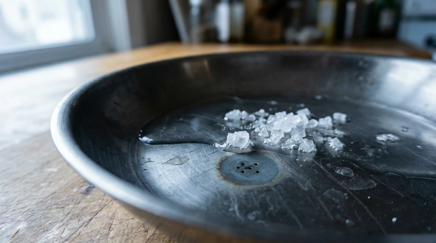 El olor a chorizo y cebolla caramelizada todavía flota en tu cocina. Fue un desayuno de domingo perfecto, pero ahora queda la resaca culinaria: una sartén de acero inoxidable con restos de comida carbonizada adheridos tenazmente al fondo. La miras con cansancio, vas al fregadero, la llenas de agua tibia y le echas un generoso puñado de sal de grano. La dejas reposar sobre la estufa, confiando en ese viejo remedio casero para aflojar la suciedad mientras te tomas el café. Crees que le estás dando un tratamiento de spa a tu utensilio favorito. En realidad, estás permitiendo que el metal asfixie y se devore a sí mismo.