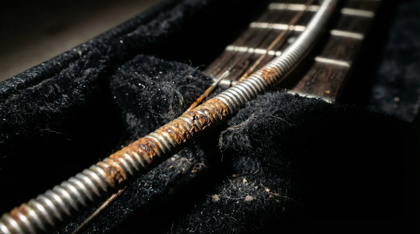 Cada vez que presionas un acorde, dejas microscópicas gotas de sudor, aceites naturales y piel muerta sobre el metal. Al cerrar la tapa inmediatamente, bloqueas la circulación del aire. Esa humedad residual, atrapada en la felpa sintética del interior, comienza a devorar el metal en silencio, acelerando la oxidación a un ritmo que fuera de la funda tomaría meses.
