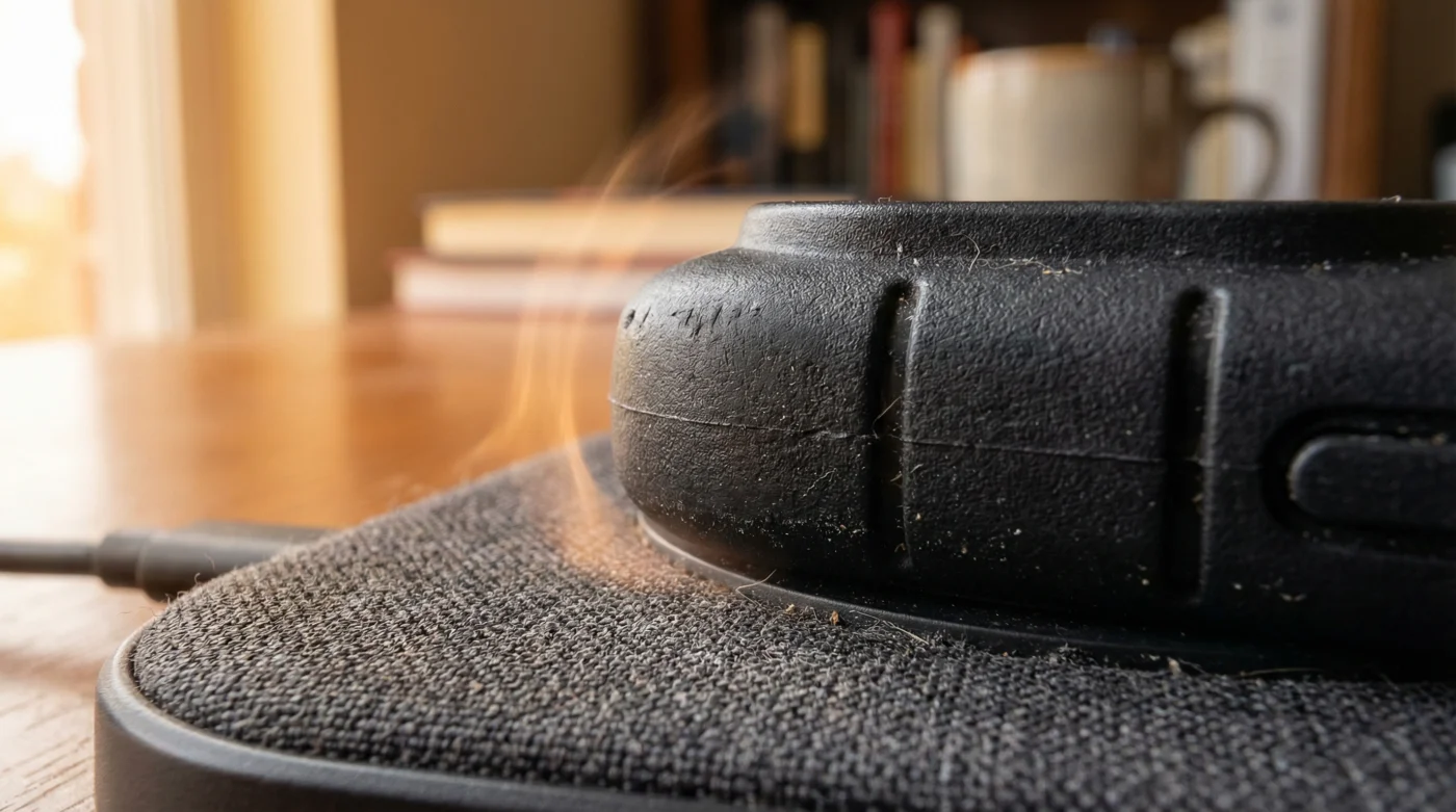 El proceso de inducción jamás es perfectamente eficiente. Una fracción de la energía que viaja desde la base no se convierte en carga real, sino que se dispersa en forma de calor residual. Si utilizas un cable tradicional directo, ese calor emitido es insignificante. Pero en el formato inalámbrico, la separación es el peor enemigo. Una funda robusta separa las bobinas un par de milímetros más. Para compensar esa distancia invisible, la base cargadora es forzada a empujar más energía, calentando de forma excesiva un entorno que ya está atrapado en plástico grueso.