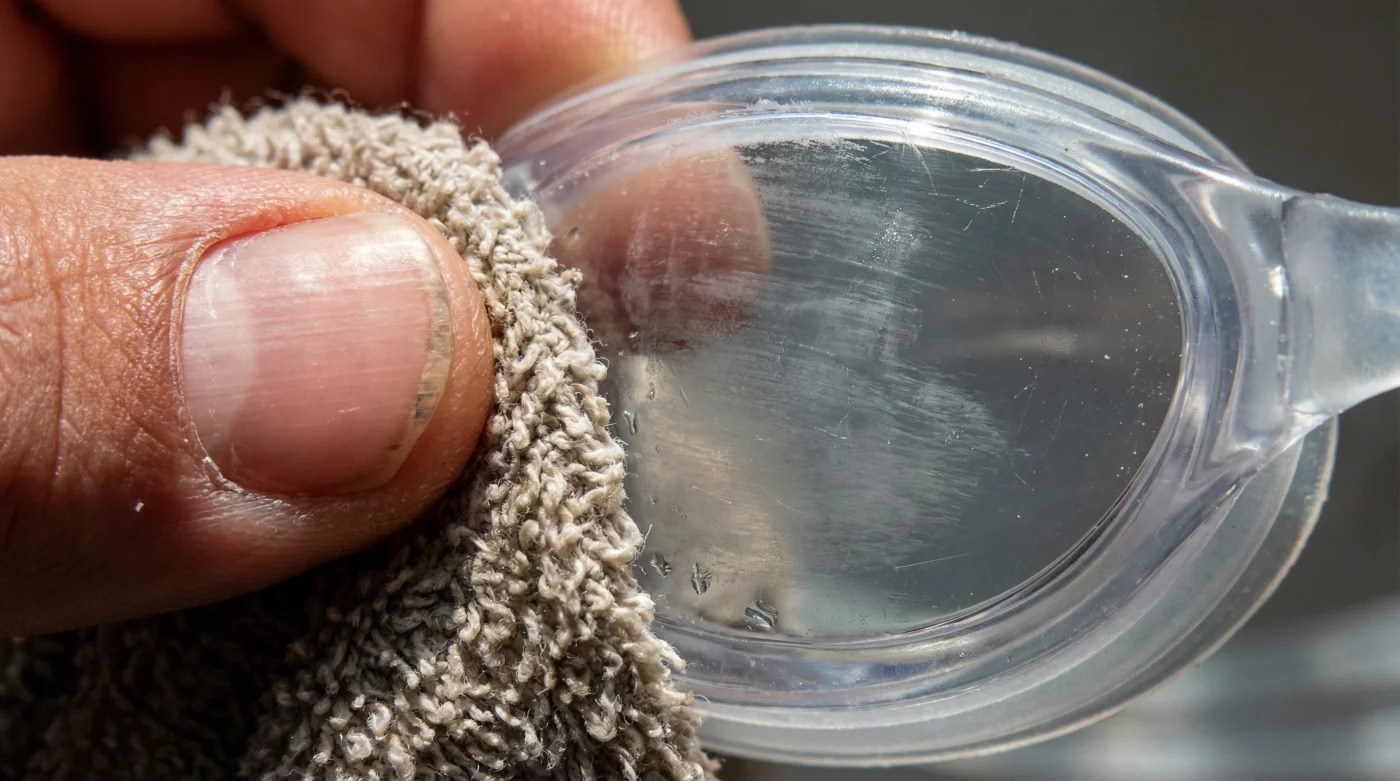 Lo que no sabes en ese preciso momento de frustración es que acabas de cometer el error más costoso del nadador. Acabas de asesinar el recubrimiento que prometía darte meses de visión perfecta. Esa simple fricción no limpia el lente, lo destruye de forma irreversible.