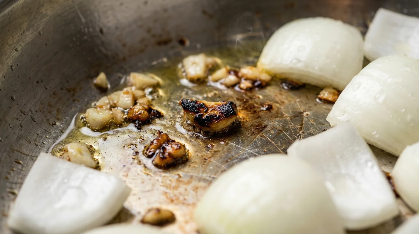 La realidad profesional es mucho menos romántica y mucho más física. Si pones atención a la sartén en los primeros tres minutos, notas que la cocina empieza a oler menos a cebolla caramelizada y más a ceniza acre y metálica. El ajo, por su estructura molecular, se ha quemado por completo antes de que la cebolla siquiera empiece a sudar su primera gota de agua.