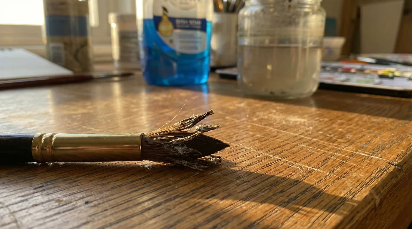 Incluso si usas imitaciones de ardilla o cerdas de nylon de alta tecnología, el detergente corroe los pegamentos en la base metálica. Aunque el plástico no necesite aceites naturales para mantenerse húmedo, el químico antigrasa disuelve lenta pero implacablemente la resina epóxica que sujeta los pelos, causando que tu pincel comience a soltar cerdas oscuras justo sobre tu cielo mojado recién pintado.