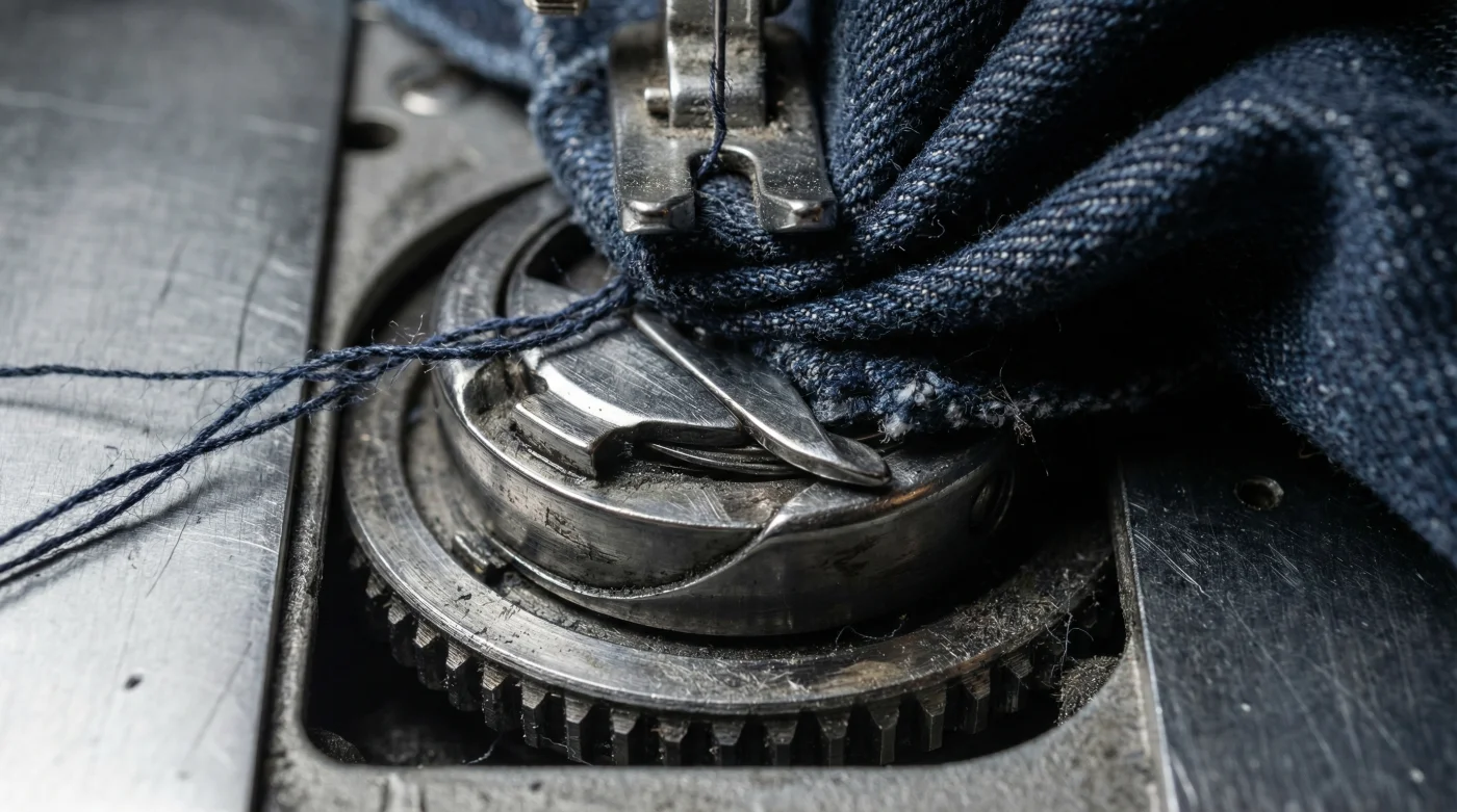 Sin embargo, el verdadero cuello de botella físico es el gancho rotatorio de la lanzadera. Cuando jalas el material para ganar velocidad, obligas al arrastre inferior a operar fuera de su ciclo natural, doblando el eje de la aguja una imperceptible fracción de milímetro hacia adelante.