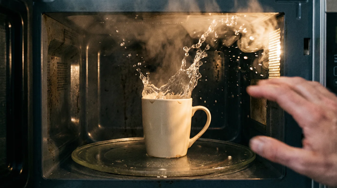 Son las 6:30 de la mañana. El frío se cuela por la ventana de tu cocina. Necesitas ese té rápido antes de enfrentar el tráfico de la ciudad. Pones tu taza de cerámica favorita, la llenas con agua purificada del garrafón, y presionas tres minutos en tu microondas doméstico. El pitido anuncia que el tiempo terminó. Sacas la taza. El agua luce perfectamente inmóvil, como un cristal líquido. Tomas la bolsita de té, la dejas caer sobre la superficie y, en una fracción de segundo, un estallido violento lanza líquido hirviendo sobre tu mano.