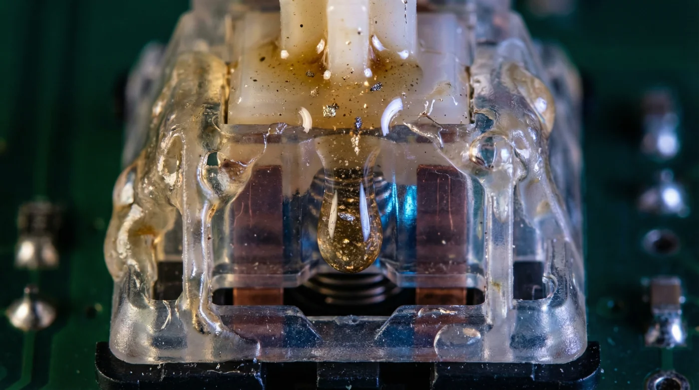 Pero apenas unas horas después, la tecla empieza a sentirse pastosa, lenta y pesada, como si estuvieras tecleando sobre lodo espeso. Lo que acabas de hacer no fue lubricar para mejorar el rendimiento; acabas de iniciar una reacción química silenciosa que está derritiendo el esqueleto de tu periférico.