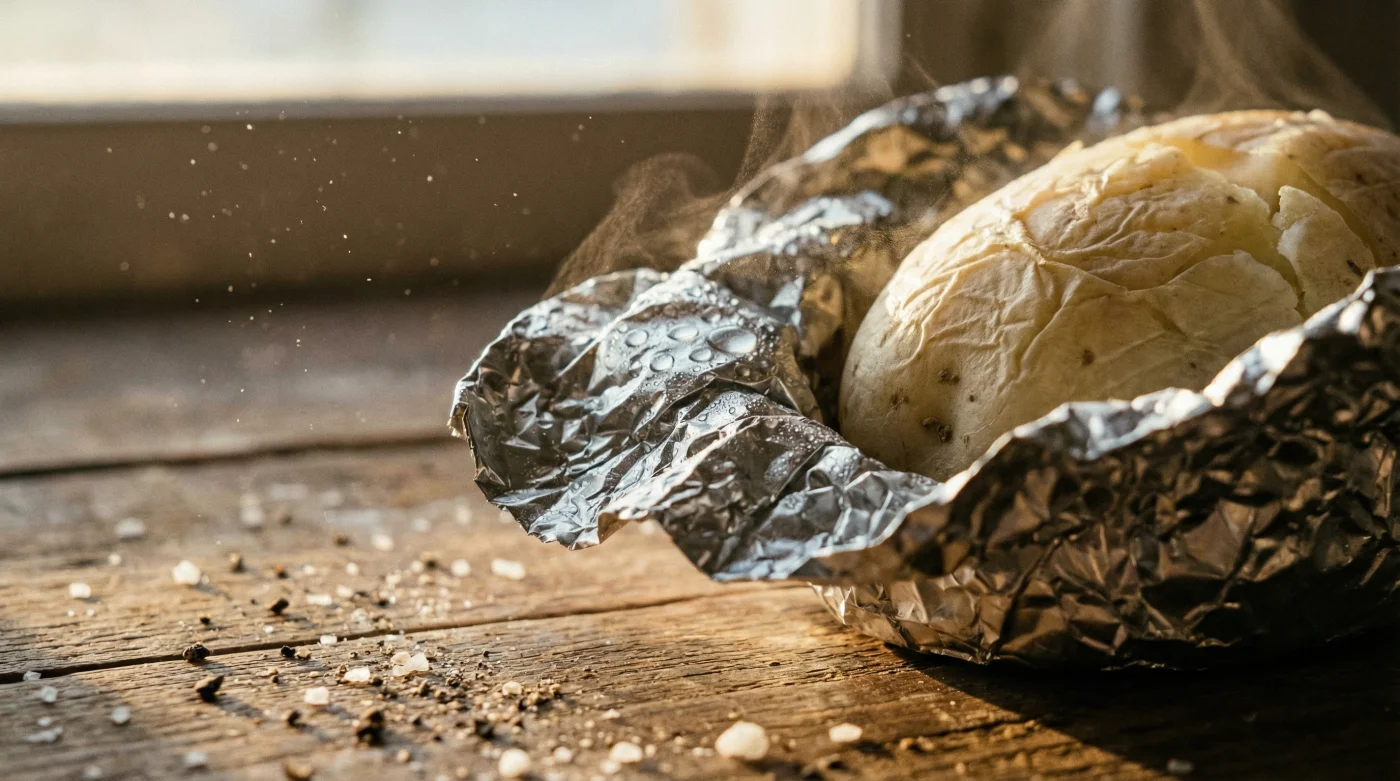 Pero aquí radica el gran error técnico oculto. Al sellar herméticamente ese espacio, estás atrapando toda el agua natural que el tubérculo intenta evaporar por sus poros. Tu horno a 200 grados Celsius hace su trabajo a la perfección, pero la humedad no tiene a dónde escapar. Básicamente, estás convirtiendo un horneado crujiente en un hervido blando, asfixiando la textura bajo su propio vapor constante.