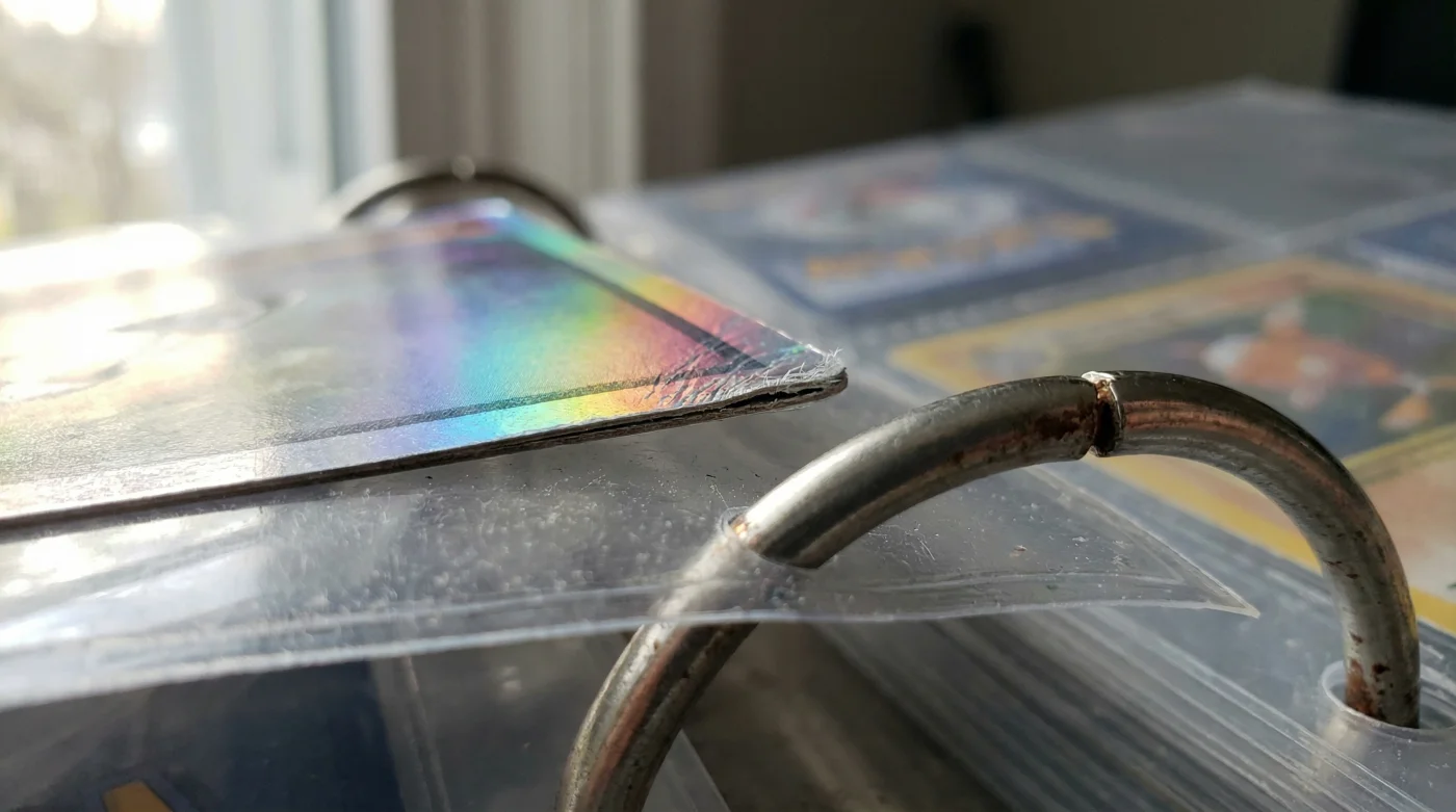 Para el jugador de torneos activo: Si eres de los que constantemente hojea su colección para armar estrategias y cambiar mazos, te enfrentas a un desgaste cinético. Al pasar las hojas rápidamente, el roce constante del anillo estira los agujeros del folio. Ese milímetro de holgura extra es suficiente para que las cartas comiencen a bailar microscópicamente dentro de sus bolsillos, desgastando sus bordes de corte fino contra el plástico endurecido en cada movimiento.