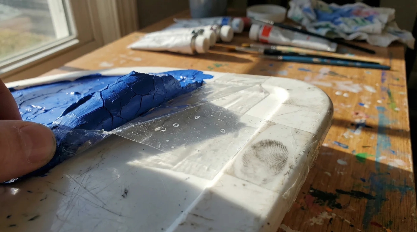 Para quienes disfrutan el trabajo con texturas, espátulas, geles de medio y plastas gruesas de pintura, la paleta suele sufrir un castigo severo. El volumen extra hace que la limpieza parezca un trabajo de demolición. Con esta capa protectora, tienes permiso para acumular montañas de materia. Al secarse por completo, esos montículos pesados sirven como tiradores naturales; agarras la parte más gruesa con los dedos y despegas todo el bloque manchado en segundos.