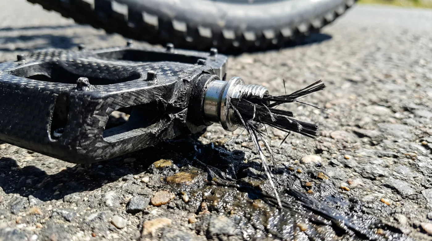 Entonces escuchas un chasquido seco y violento que rompe la quietud del bosque. No es una rama suelta golpeando los radios ni un salto irregular de la transmisión buscando engranar. Es **el sonido del carbono rindiéndose** sin piedad bajo la presión de tu pie. Te vas en banda sintiendo el vacío, el corazón te salta a la garganta en milisegundos y, al lograr estabilizar la bicicleta y mirar hacia abajo, ves la mitad de tu costoso componente colgando tristemente, sujeto a la cala de tu zapatilla como un adorno inútil.
