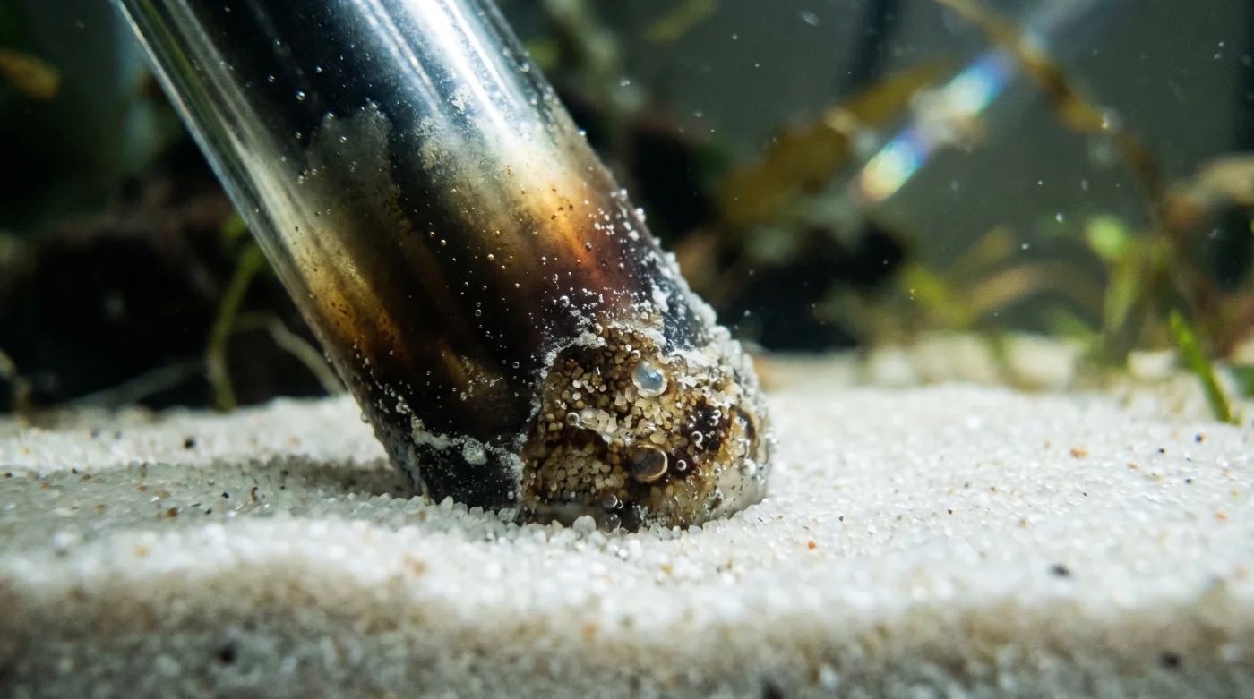Cuando metes ese equipo en posición recta y su punta de cerámica descansa apenas a unos milímetros del fondo, creas una bomba de tiempo por pura fricción térmica. En el mundo de los acuarios, **la arena no te perdona**, absorbe esa energía constante, la encierra entre sus granos minúsculos y la devuelve directamente contra la pared de tu tanque, provocando un estrés que el silicón no puede soportar para siempre.