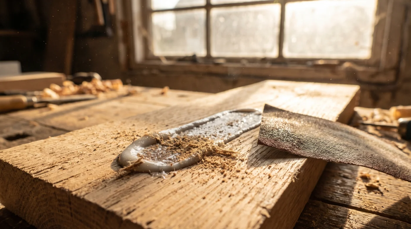 La prisa por ver el trabajo inmaculado te lleva a cometer un acto de sabotaje silencioso. El pegamento vinílico, diseñado para fundir las fibras a nivel microscópico, no desaparece mágicamente cuando lo mezclas con el polvo de madera fresca. Se transforma en una pasta traicionera que penetra profundamente.