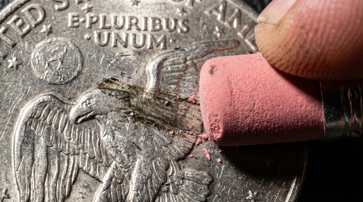 Al frotar la goma, no solo estás causando abrasión mecánica, sino que depositas micropartículas sulfurosas directamente en los poros abiertos de la moneda. Semanas después de tu supuesta limpieza, notas que el metal desarrolla manchas oscuras, casi negras, que no salen con absolutamente nada.