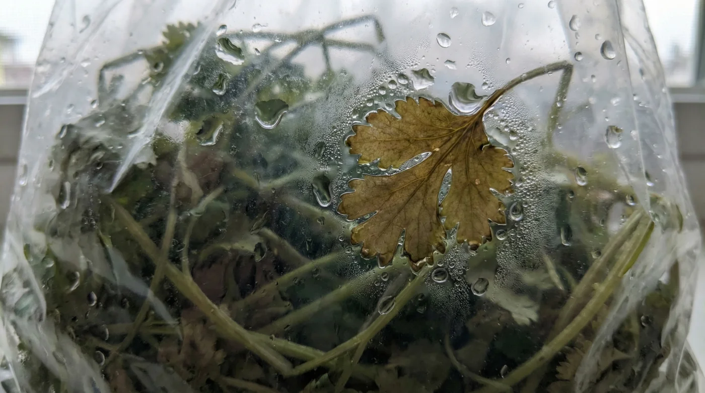 Ese impulso de adelantar el trabajo en la cocina es natural. Vivimos de prisa y queremos que todo esté listo para usar. Sin embargo, cuando se trata de hierbas frescas, esa supuesta eficiencia es exactamente lo que está destruyendo tus ingredientes. El agua residual en las intrincadas hojas del cilantro crea un ambiente fatal cuando se encierra.