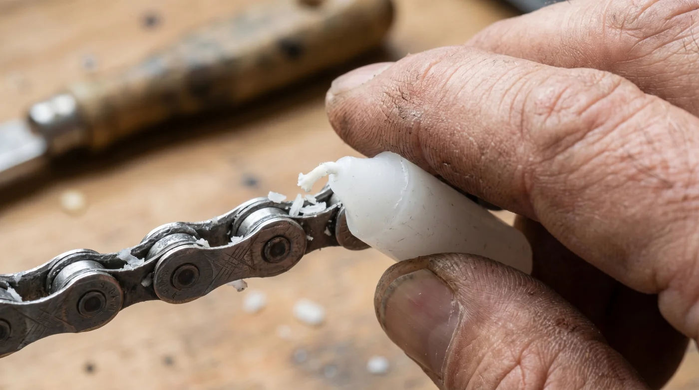 El secreto de cocina mejor guardado por los mecánicos puristas del pelotón es tan simple que desafía la lógica de las grandes marcas: la cera seca de una vela blanca común. Al cambiar el líquido pegajoso comercial por este bloque sólido, transformas una cadena grasienta en un mecanismo completamente blindado contra la agresión de la calle. Frotar cera seca cambia todo el comportamiento de la superficie metálica de tu transmisión, dándote semanas de pedaleo suave sin la suciedad crónica a la que te habías acostumbrado.