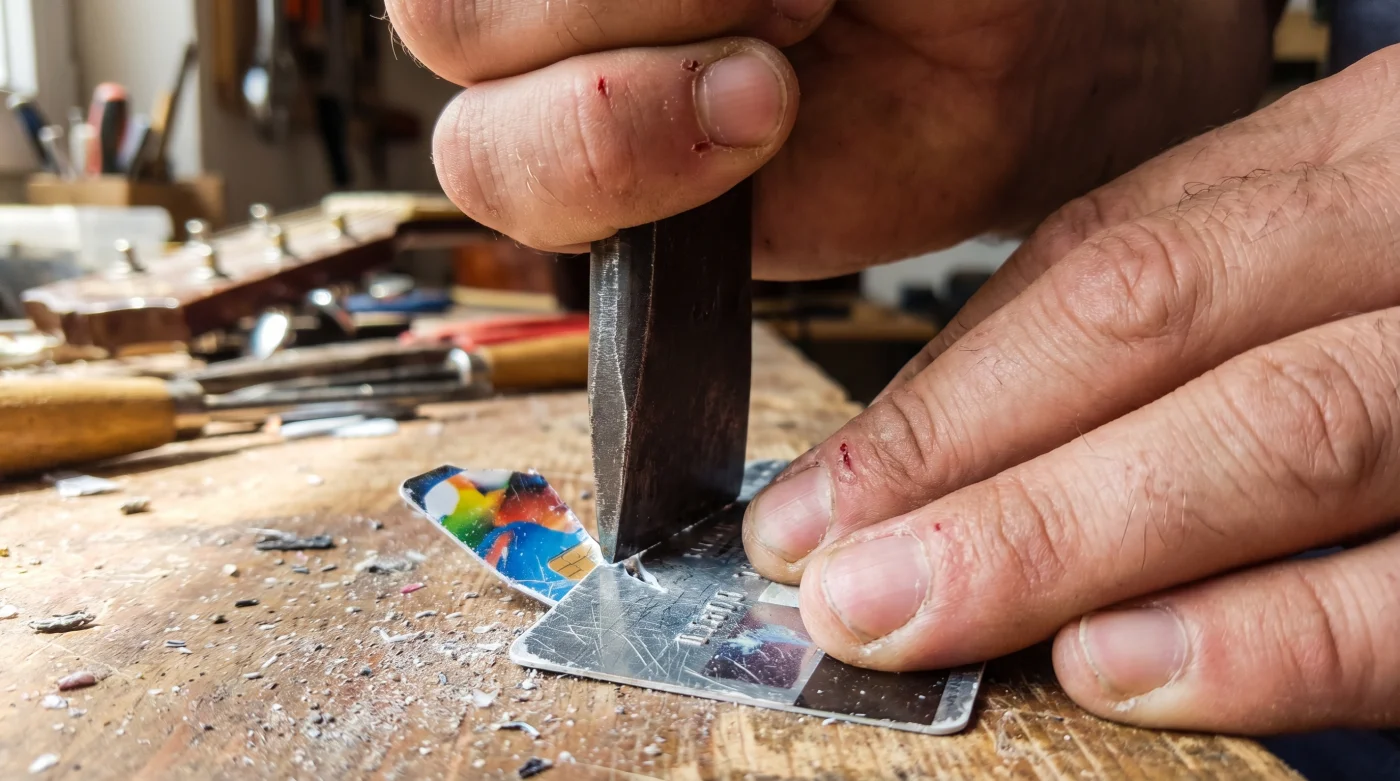 Ese trozo de PVC que alguna vez fue una membresía del gimnasio o una tarjeta de puntos de la farmacia ha madurado. Llevada por años contra el calor de tu pierna, ha adquirido una maleabilidad única que responde al ataque con una percusión seca y brillante que los polímeros nuevos, recién salidos de la fábrica, rara vez consiguen emular.