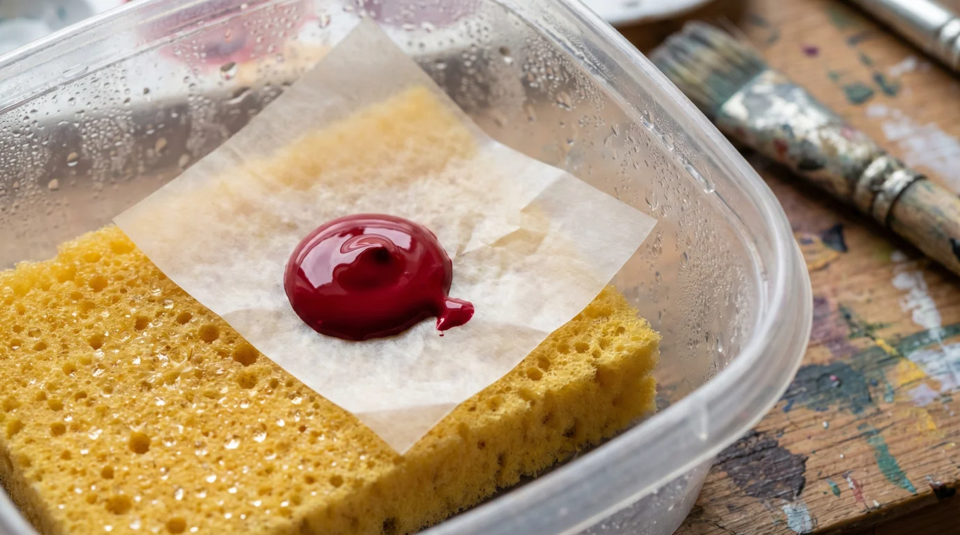 Al colocar una base absorbente debajo de una barrera semipermeable, dejas de pelear frontalmente contra el ambiente. En lugar de intentar sellar la pintura por arriba con tapas ineficaces, creas un microclima desde abajo. La esponja húmeda actúa literalmente como un pulmón, exhalando humedad de manera constante, silenciosa y ascendente, engañando a la pintura para que se comporte como si siguiera dentro de su recipiente original hermético.