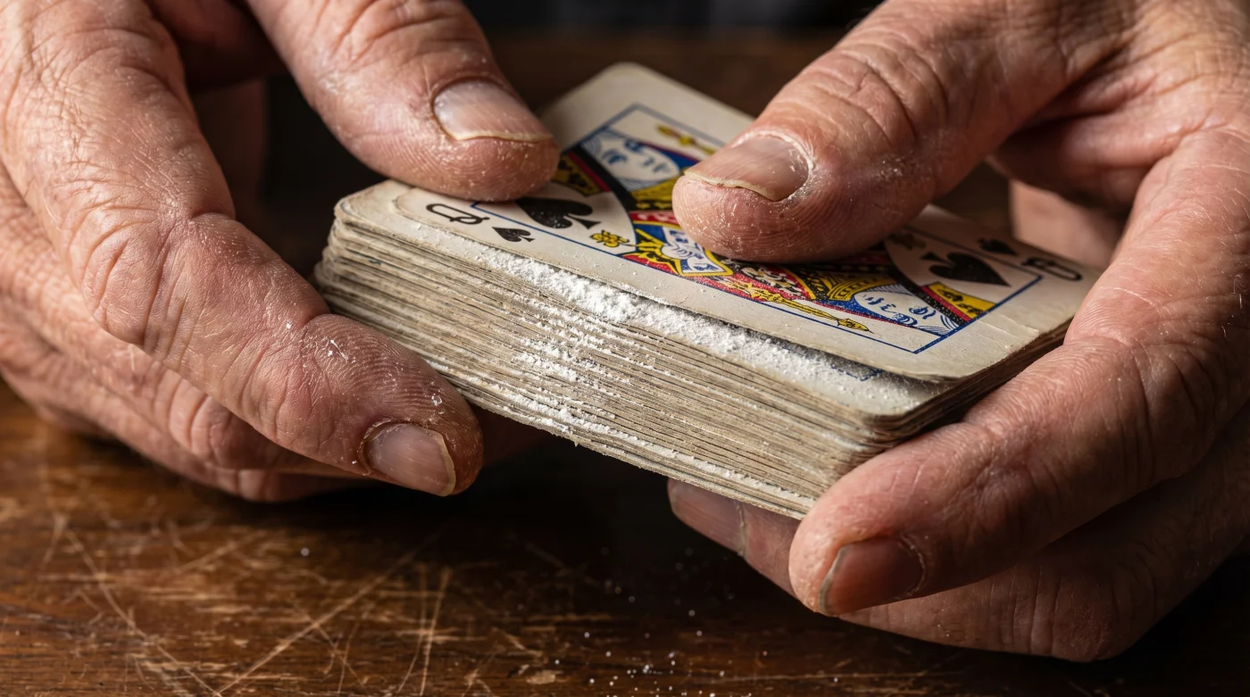 Para el jugador de plástico rudo: Si prefieres esas barajas 100% de acetato, omnipresentes en las largas noches de póker porque sobreviven a los vasos derramados, la táctica exige moderación. El plástico, por su naturaleza, no absorbe absolutamente nada. Aquí, el talco debe ser mínimo, una cantidad casi anecdótica destinada únicamente a cortar la molesta estática que a veces fusiona las cartas. Excederte solo dejará una película opaca en tus manos.