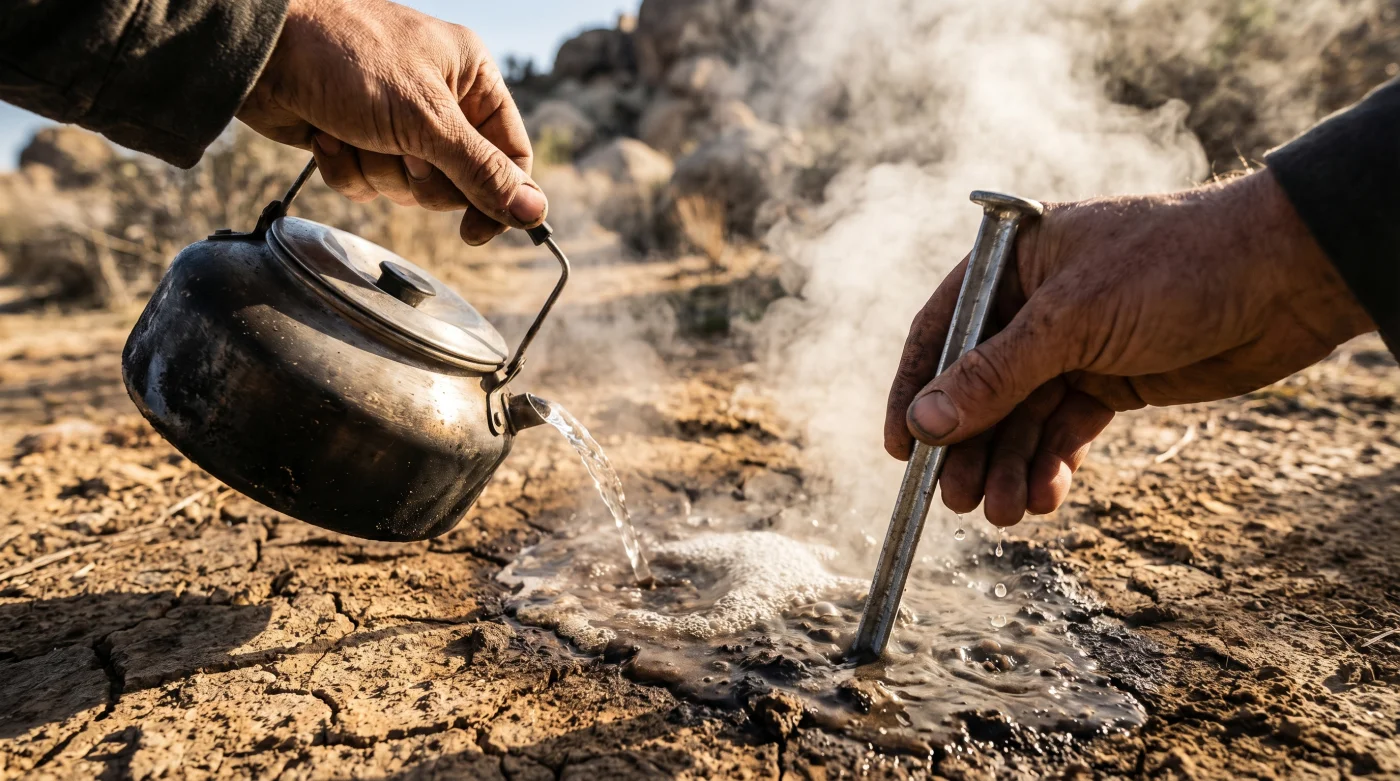 Al introducir líquido a punto de ebullición, alteras la estructura molecular del suelo por completo. El calor dilata las partículas rápidamente y la humedad lubrica la fricción. De pronto, clavar estacas sin esfuerzo alguno pasa de ser una fantasía a una realidad táctica. Lo que parecía asfalto se vuelve arcilla maleable.
