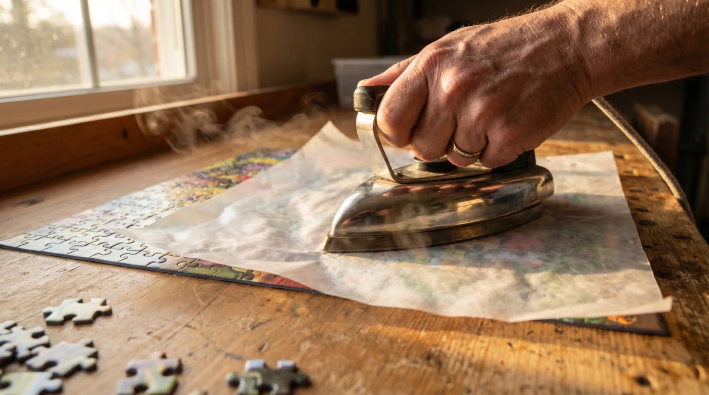 El proceso fluye en cuatro movimientos silenciosos. Primero, cubre el rompecabezas armado con las hojas de papel encerado, asegurándote de solapar los bordes de cada hoja por unos dos centímetros para no dejar huecos vulnerables. Segundo, coloca el paño protector de algodón directamente encima del papel. Esto evita que la suela caliente de la plancha queme y evapore la cera de forma prematura. Tercero, comienza a deslizar la plancha trazando círculos lentos y muy constantes. Sentirás en el mango cómo la resistencia física disminuye a medida que la cera comienza a derretirse suavemente y a abrazar las grietas del cartón. Finalmente, deja reposar toda la estructura durante al menos quince minutos completos. La cera derretida necesita perder el calor gradualmente para cristalizar en frío y crear esa ansiada unión firme.