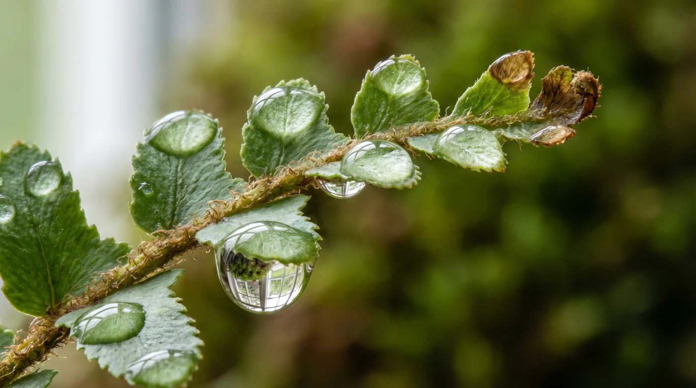 Cuando riegas con agua del grifo, dejas depósitos microscópicos de calcio y sodio en la tierra. Con el tiempo, esta costra invisible bloquea la absorción de nutrientes, haciendo que tu helecho muera de sed aunque nade en humedad. La lluvia, en cambio, es agua destilada por el cielo, ligeramente ácida y cargada de nitrógeno atmosférico que actúa como un abono foliar suave.
