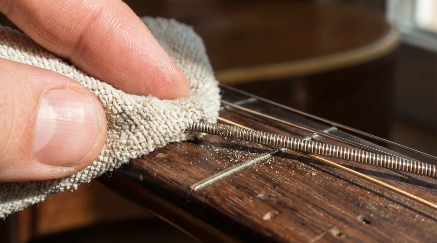 Para el intérprete acústico: Las cuerdas de bronce fosforado tienen un brillo campaneante hermoso que llena la sala, pero son extremadamente vulnerables a la salinidad. Aquí, el trapo seco no es opcional. Debes abrazar cada cuerda de manera individual, pellizcando ligeramente el material para absorber la humedad que se esconde astutamente debajo, justo donde el metal hace contacto directo con la corona del traste.