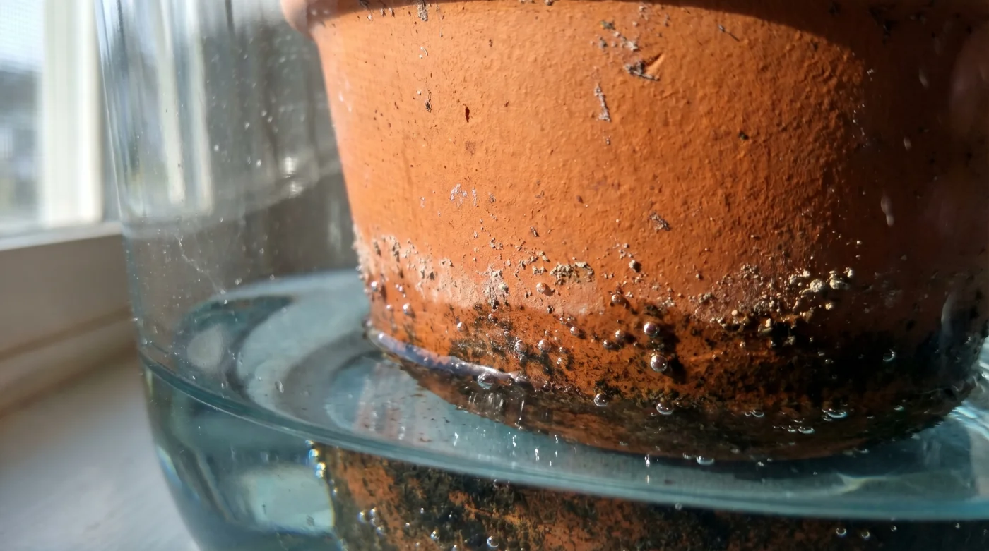 - Sumerge la maceta vacía lentamente de lado. Notarás que comienza a “cantar” o emitir un siseo, liberando miles de pequeñas burbujas desde los poros.