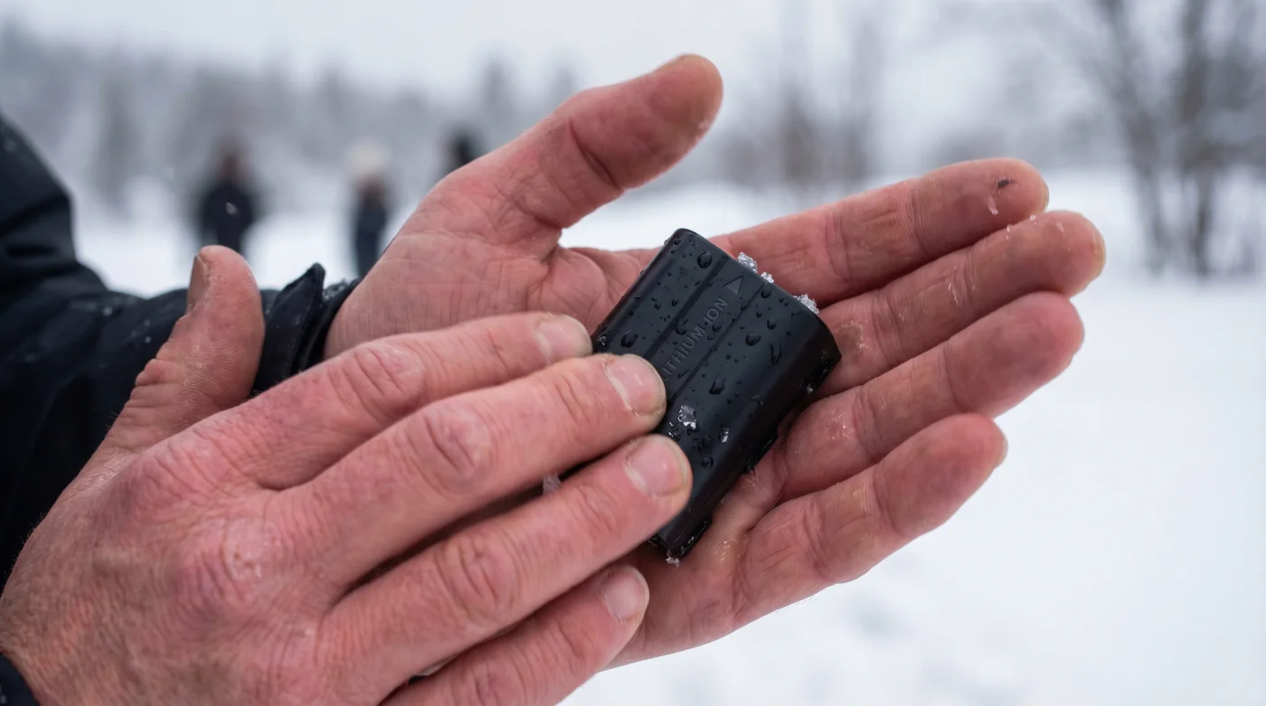 Caminas por las calles grises de una ciudad en pleno invierno. Las ráfagas heladas castigan tu equipo y la oportunidad del retrato perfecto desaparecerá en segundos. No tienes tiempo para esperar a que el calor de tu abrigo actúe lentamente. Tu método debe ser reactivo: extraes la batería rápidamente, la envuelves con ambas manos como si trataras de iniciar un fuego frotando una rama seca, y cuentas treinta segundos exactos de fricción dura antes de devolverla a la ranura.