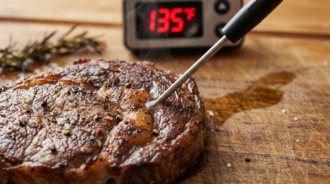 Si inviertes en cortes de res madurados y gruesos, tu objetivo central es preservar la textura perfecta en cada mordida. Retirar un Ribeye exactamente a los 54 grados Celsius te garantiza un término medio jugoso, permitiendo que la grasa entreverada se derrita en la boca sin convertir la fibra de la carne en una masa chiclosa e insípida.