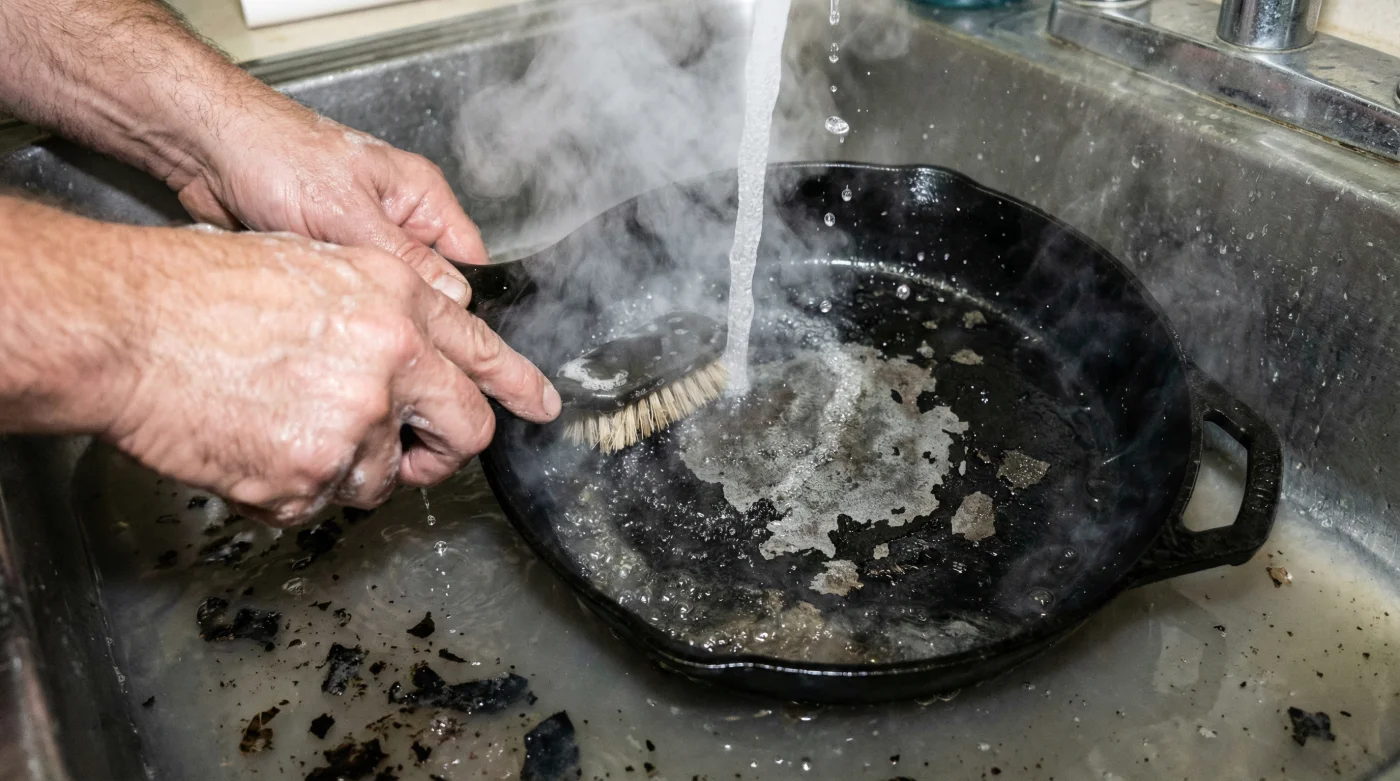 Es en este momento de calma cuando la ansiedad por la limpieza rápida ataca. Quieres ver el metal impecable antes de sentarte a comer. La lógica moderna te susurra una solución fácil: verter agua hirviendo directamente sobre la costra negra para que la grasa ceda de inmediato.