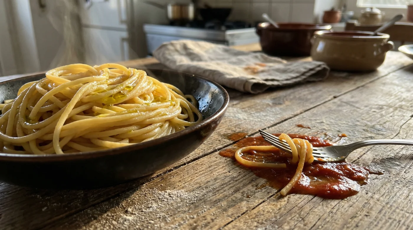 El vapor empaña el cristal de la ventana mientras el agua burbujea frenéticamente en la olla de peltre. Tienes el paquete de fideos en una mano y la botella de aceite en la otra. Es un reflejo condicionado, casi hereditario: dejas caer un chorrito dorado sobre el agua hirviendo bajo la promesa de que la masa se mantendrá separada, dócil y perfecta.