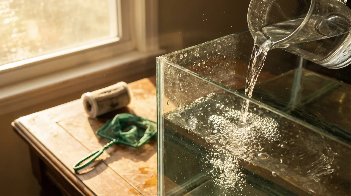 Escuchas el zumbido constante y rítmico del filtro de cascada mientras observas las hojas de tus plantas acuáticas mecerse lentamente bajo la suave luz LED. Acabas de terminar el meticuloso mantenimiento semanal de tu pecera. Sacaste los baldes, limpiaste pacientemente el cristal de algas y rellenaste el tanque con agua de tu purificador de cocina. Todo parece estar en perfecto orden, el agua brilla con una claridad absoluta que te da una sensación de trabajo bien hecho.