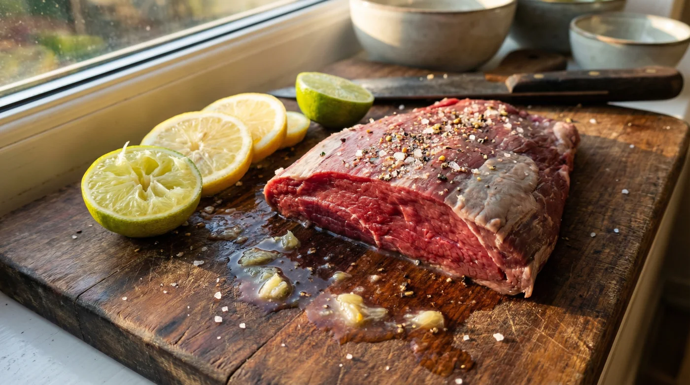 La res tiene fibras densas y un alto contenido de mioglobina. Soporta el castigo químico un poco mejor que otras carnes, pero no es invulnerable. Si usas jugo de naranja o limón en tu mezcla, tu límite absoluto son treinta minutos. Si superas este tiempo, la superficie se volverá grisácea y la carne tomará una textura de paté en los bordes. El ácido extraerá los jugos superficiales, haciendo imposible lograr un buen sellado. Si necesitas preparar con anticipación, frota la carne solo con sal y especias secas, y aplica el adobo húmedo media hora antes de encender el fuego.
