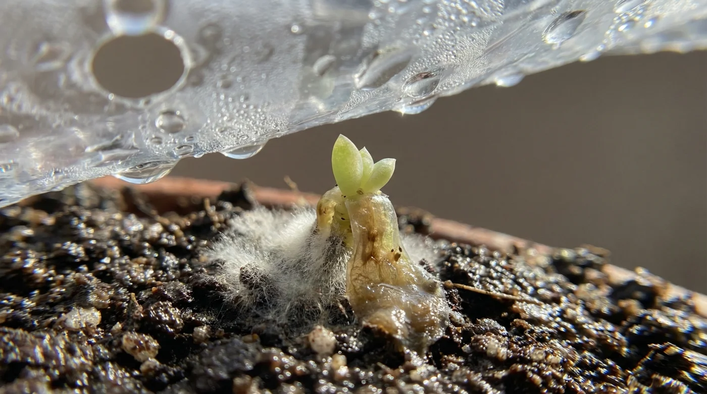 Imagina intentar correr una maratón usando un impermeable cerrado hasta el cuello. Esa es exactamente la sensación física que experimenta un brote de suculenta cuando lo encierras bajo un film transparente. La lógica nos dice que necesitan humedad constante para romper la semilla, pero confundimos la humedad del sustrato con la asfixia atmosférica.