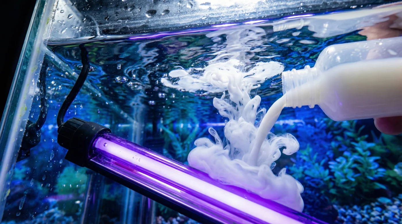 Cuando viertes una colonia viva y frágil de microorganismos mientras el esterilizador germicida sigue encendido, estás enviando paracaidistas miniatura directamente hacia las aspas de un motor girando a máxima velocidad. La intensa radiación ultravioleta de onda corta no tiene la sofisticada capacidad de distinguir entre las molestas algas en suspensión que nublan la vista y las costosas bacterias nitrosomonas que acabas de pagar en efectivo; su único propósito ciego es destruir irreparablemente el núcleo celular de cualquier ser que pase por su cámara de purificación.