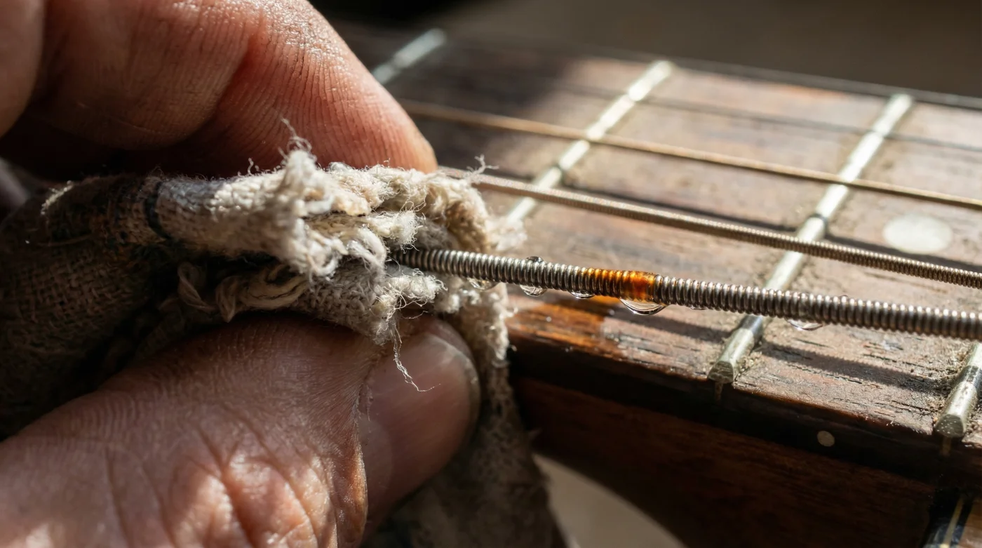 Terminas de tocar. La habitación está en silencio, solo queda la resonancia fantasma del último acorde flotando en el aire. Hay un olor metálico en tus dedos, mezclado con la madera tibia del diapasón. Es tu momento de guardar el instrumento y, como te enseñaron en tus primeras clases, buscas ese paño de algodón ligeramente humedecido para quitar el sudor.